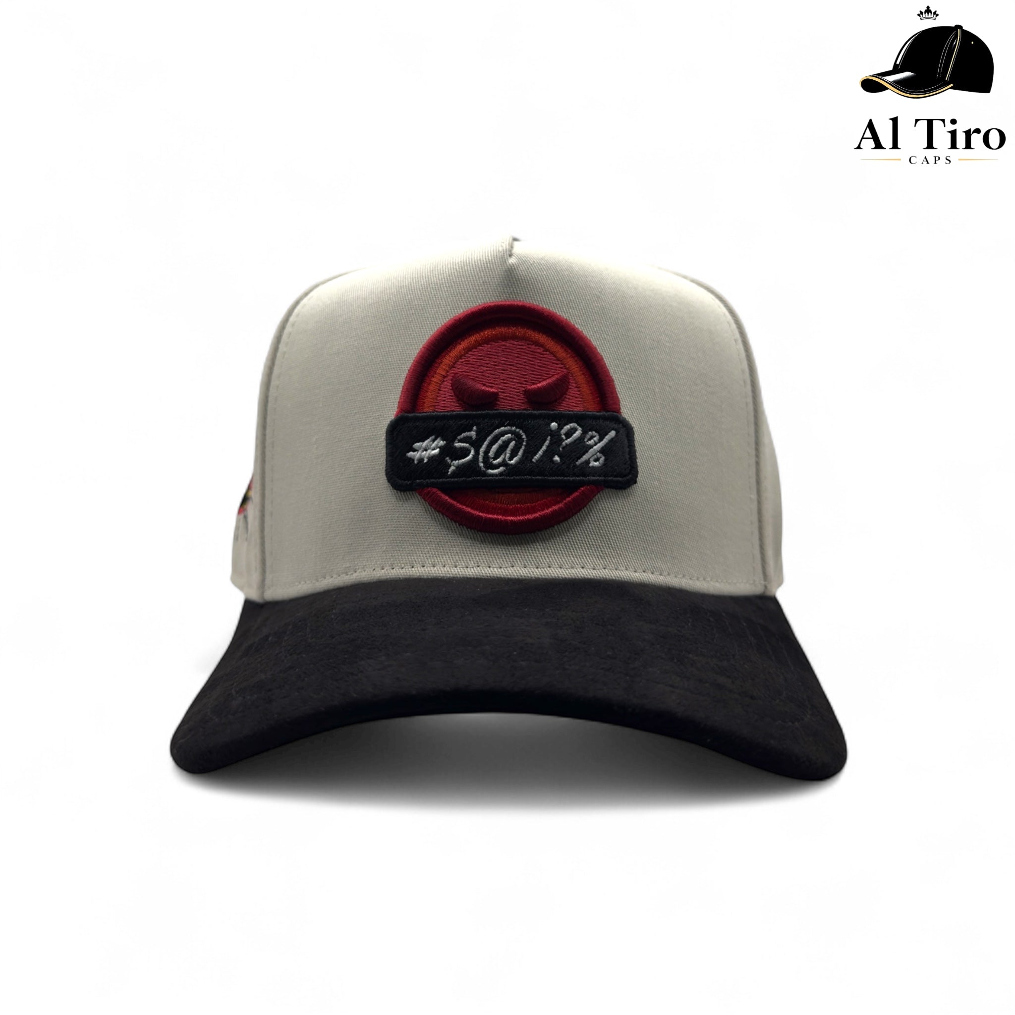 Gorra JC Hats – Beautiful Disaster “Angry Black”. Frente con parche 3D del emoji “angry” y banda rojo vino, visera tipo gamuza, arte lateral bordado y...