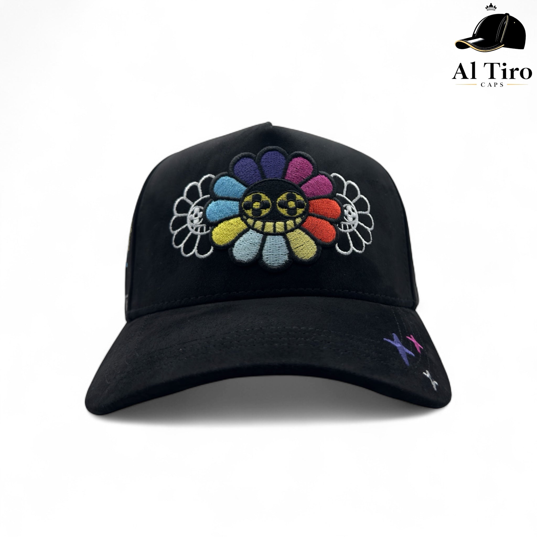 Gorra premium con frente bordado “Flowers” multicolor en alto relieve, estrellas laterales y triple flor en la parte posterior. Corona estructurada de 6 paneles, acabado tipo...