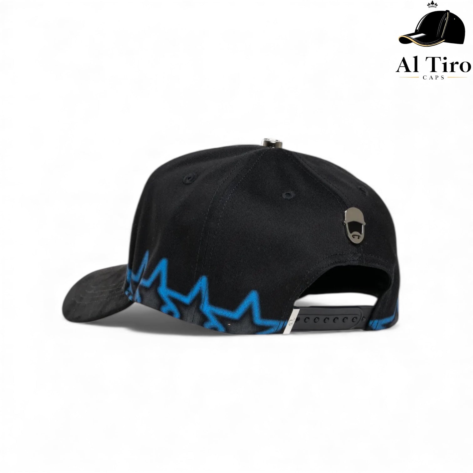 La gorra El Barbas Triple BBB es de esos modelos que llaman la atención desde lejos. Fabricada en color negro con detalles en azul eléctrico, combina las letras metálicas BBB al frente con estrellas y efectos tipo aerógrafo que recorren la parte frontal y los laterales, dándole un look callejero y muy actual.